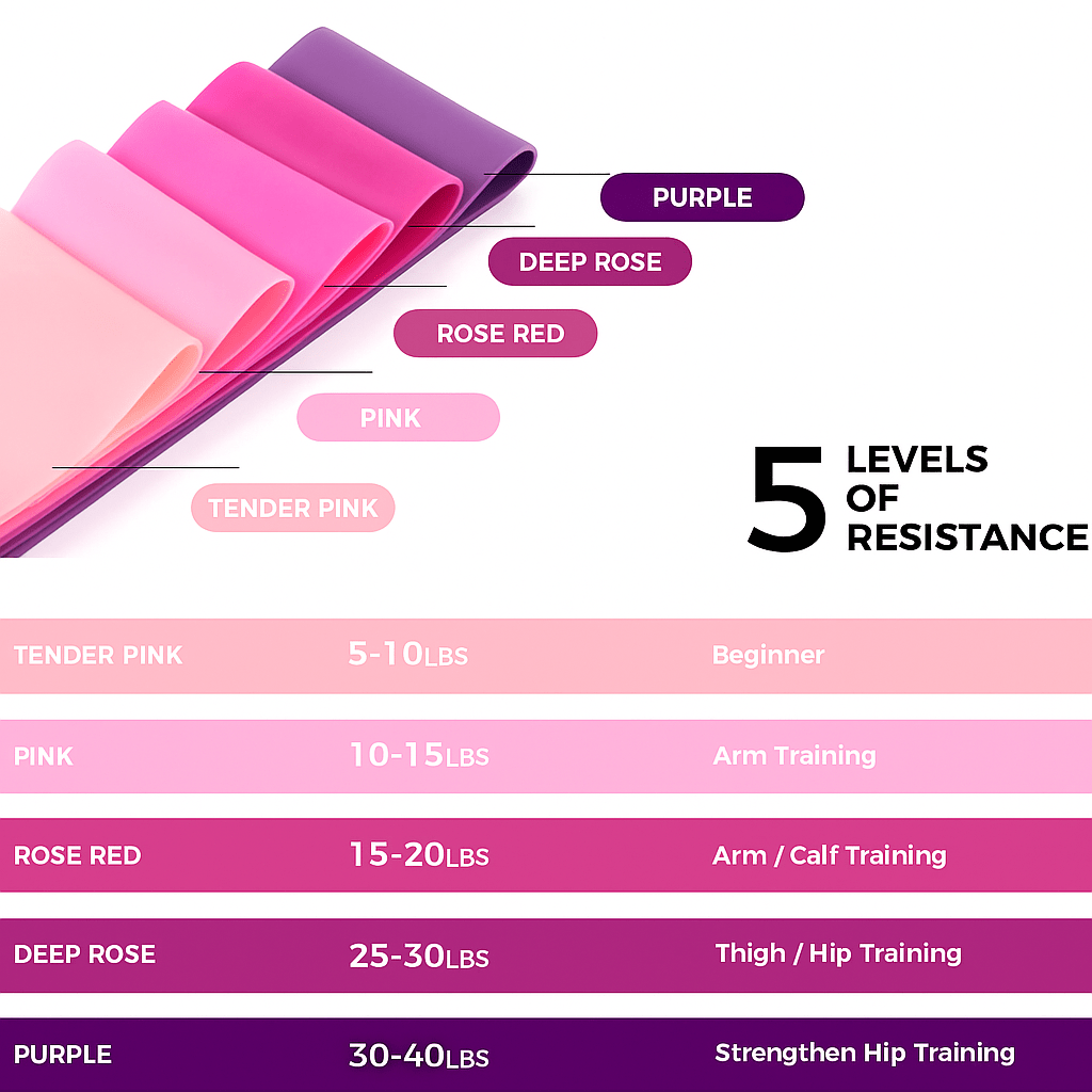Das Fitnessband Set: Von extra leicht bis extra schwer – mit dabei sind alle Stärken, die du brauchst. Jedes Band hat eine unterschiedliche Dicke und sorgt für individuellen Trainingswiderstand – perfekt für ein progressives Workout zu Hause, im Gym oder unterwegs.